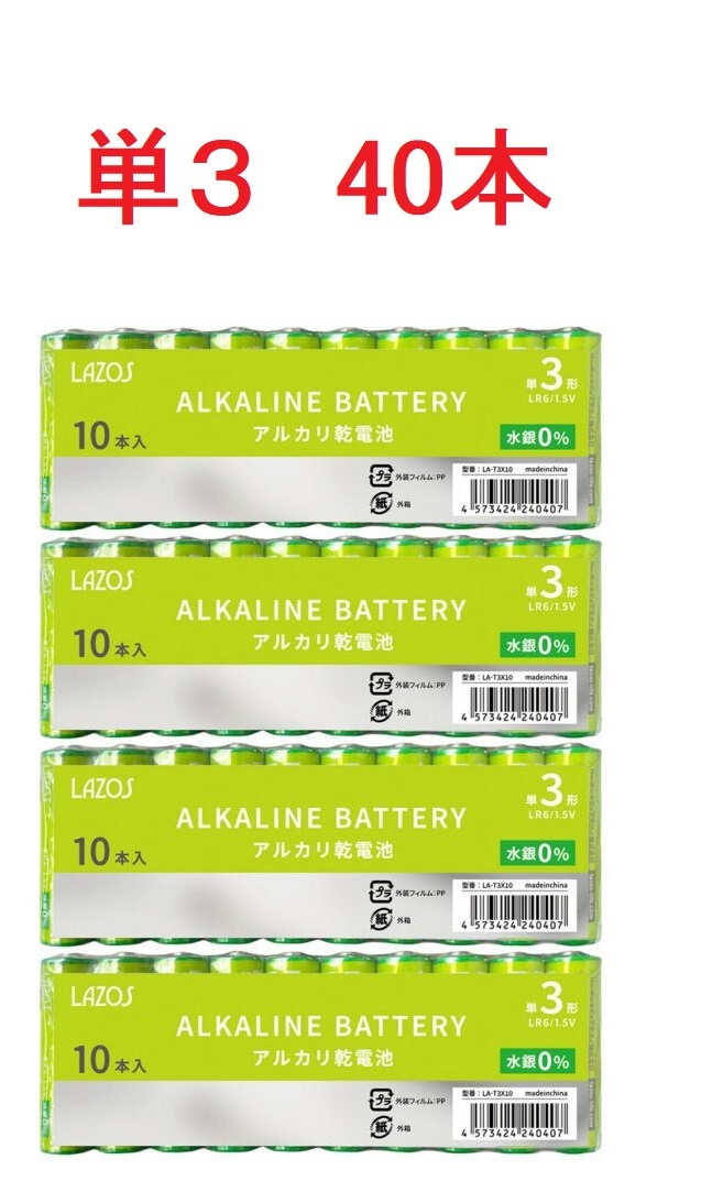 LAZOS アルカリ乾電池 単3形 10本セット×4個(単3形 40本) LA-T3X10